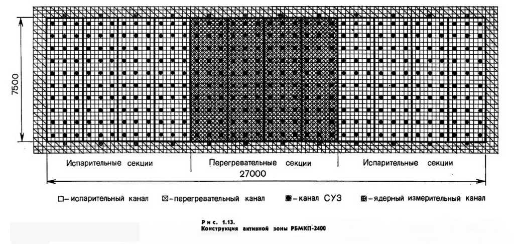 The diagram above further dissects the reactor core design further. The rectangle (27,000mm x 7,500mm = 27m x 7.5m) is the active zone. The outer regions (Испарительные секции, evaporator sections) contain evaporator channels, where water turns into steam. The central region labeled Перегревательные секции (Superheater section) contains the superheater channels. Here, the steam is further heated into a higher temperature. The black squares are Control & Protection System channels (СУЗ), where the control rods are. The small, patterned squares with a dot are nuclear instrumentation channels, to monitor neutron flux and reactor power distribution.