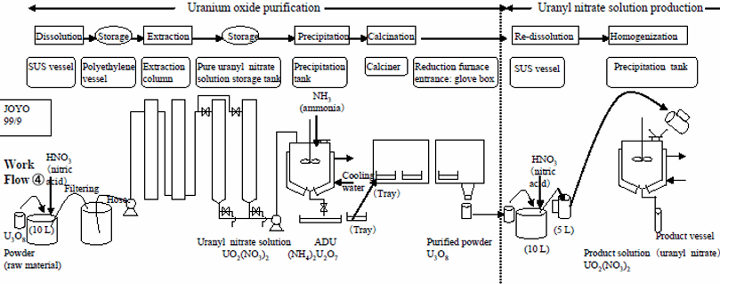 From the morning of 29th September 1999, three workers were preparing a small batch of fuel for the JOYO experimental fast breeder reactor, using uranium enriched to 18.8% U-235. The aim was to manufacture 57 kg U of UNH solution for the fuel processing, which was to be used in JOYO. According to the IAEA report in 1999, “The workers were only cautious of avoiding the sedimentation of solution, without any consideration of a “supercritical mass” problem. There was a mass limitation, the so-called “one batch restriction”, which strictly restricted the mass to less than 2.4 kg U for each step of all production processes.”
